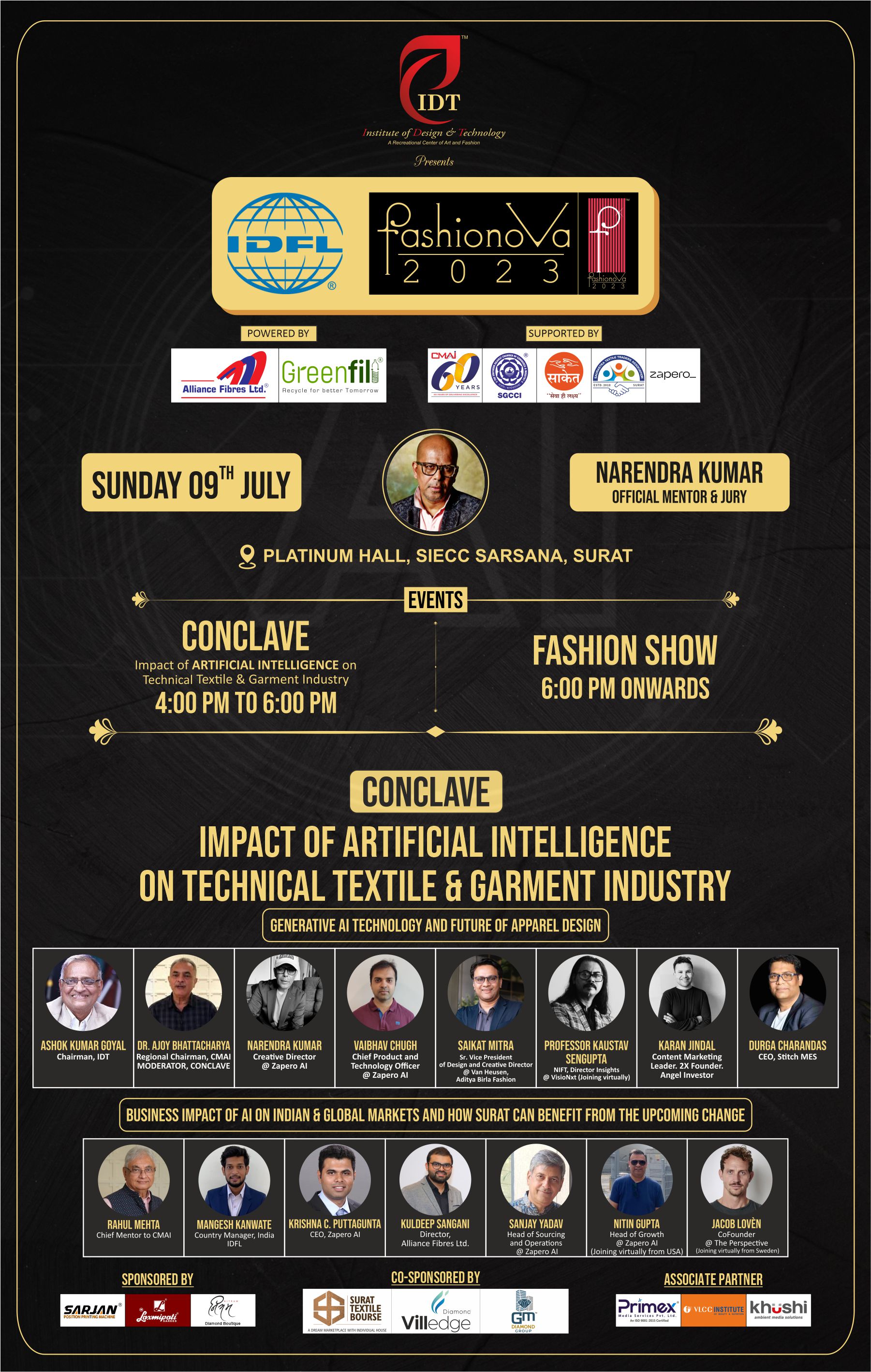 The program includes a conclave on the "Impact of Artificial Intelligence on Textile and Garment Industry." It is then followed by a Fashion Show to give direction to the growth of the Garment Industry of Surat. The collection is curated by the Student designers of IDT and mentored under Ace Designer Narendra Kumar.